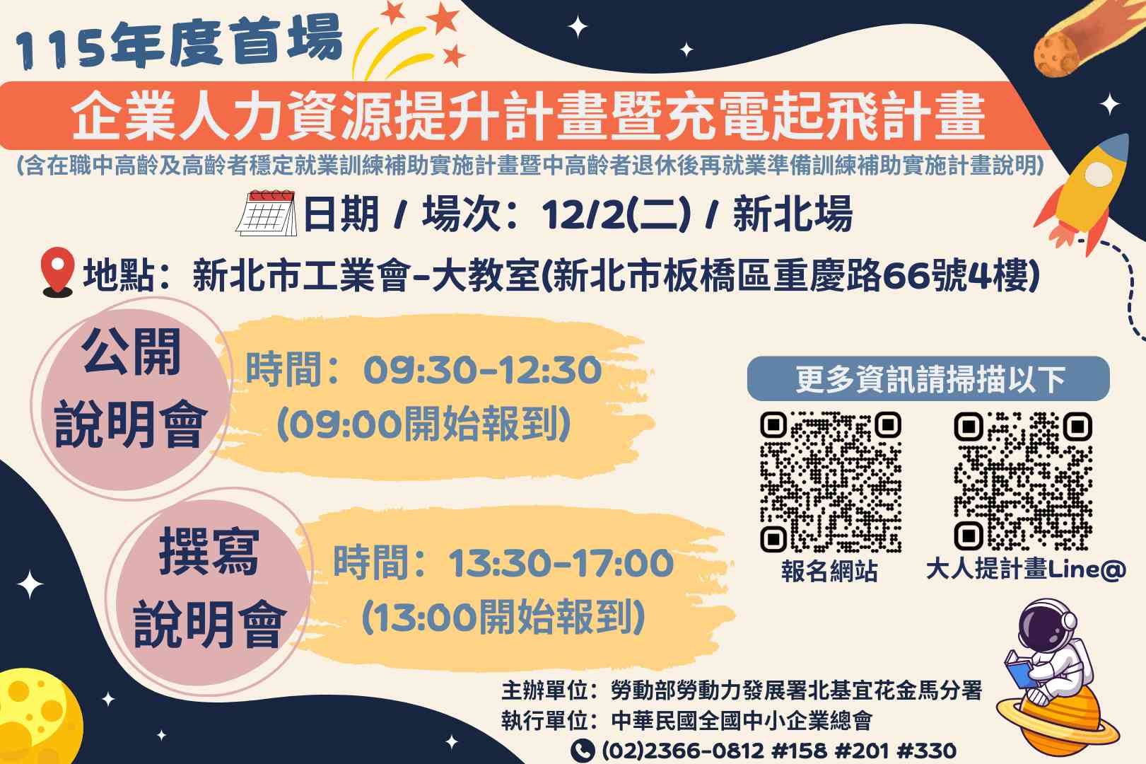 115年度「企業人力資源提升計畫」、「充電起飛計畫」即將於今年12/1起開始受理申請!為使欲申請本計...